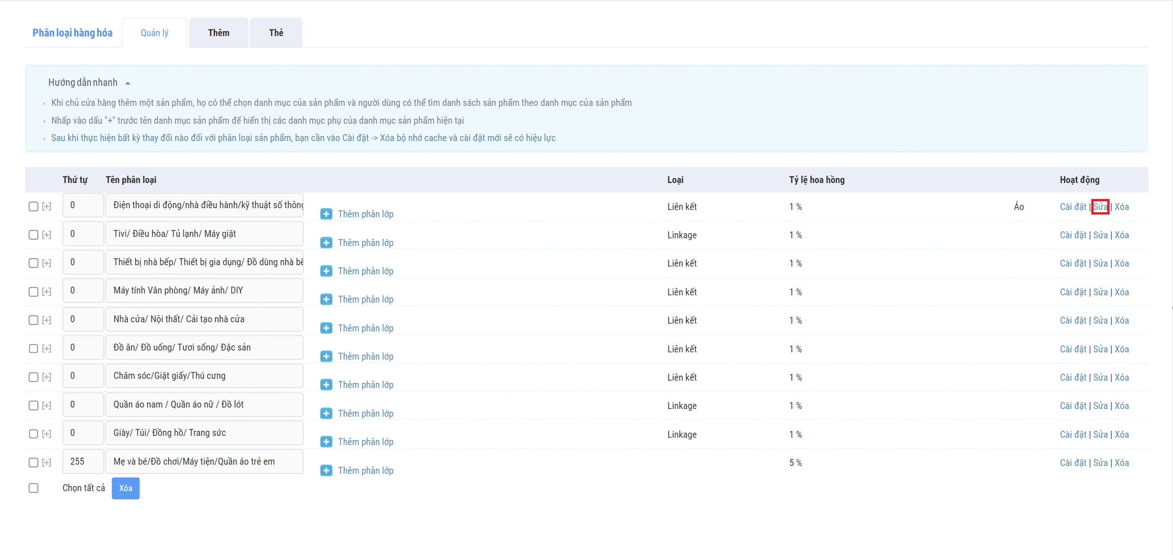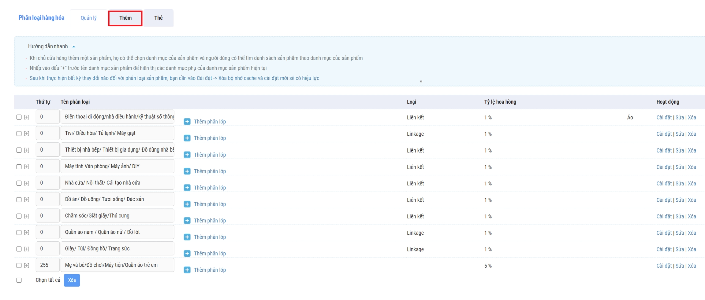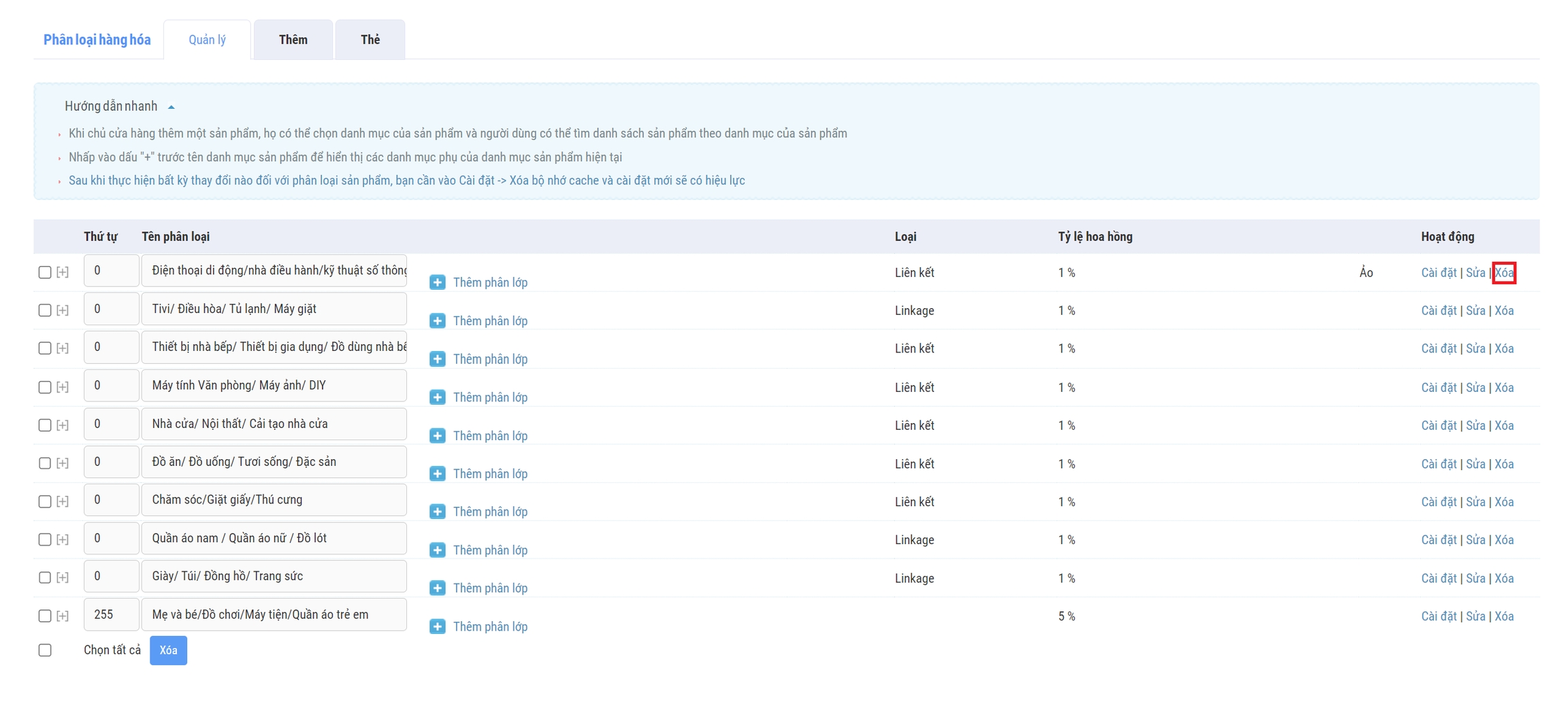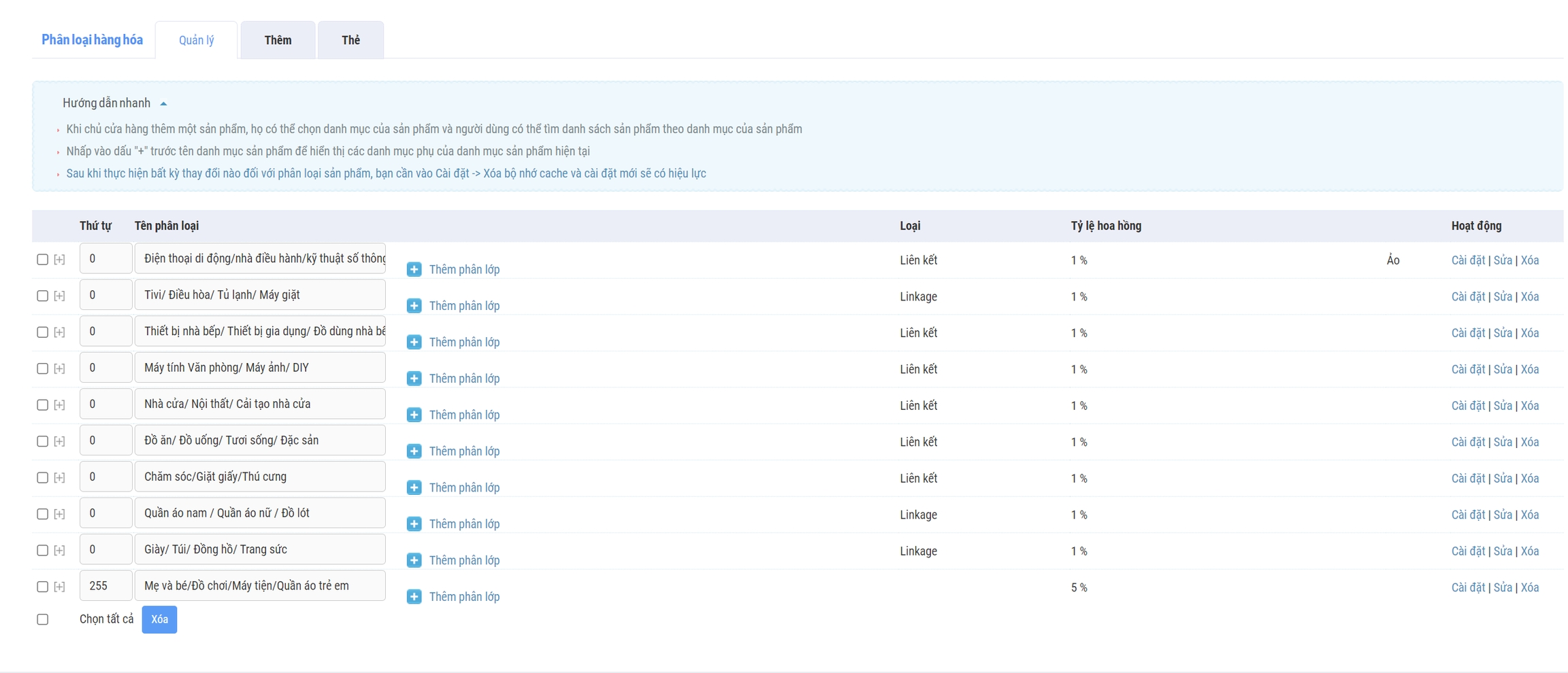 Chức năng giúp người dùng quản lý các danh mục ngành hàng trên sàn TMĐT