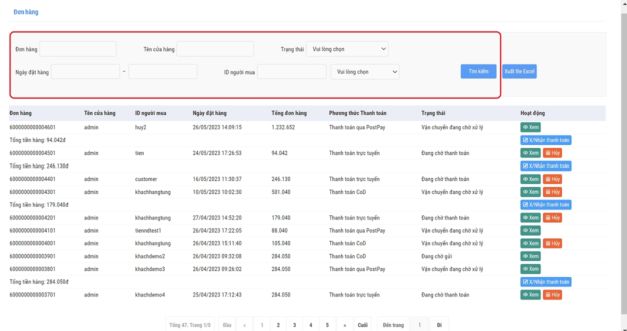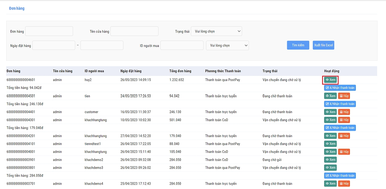 Chức năng giúp người dùng quản lý các đơn hàng vật lý trên sàn TMĐT Postmart (Người đặt hàng, cửa hàng, trạng thái đơn hàng, giá trị đơn hàng, các sản phẩm, phương thức thanh toán, ...)