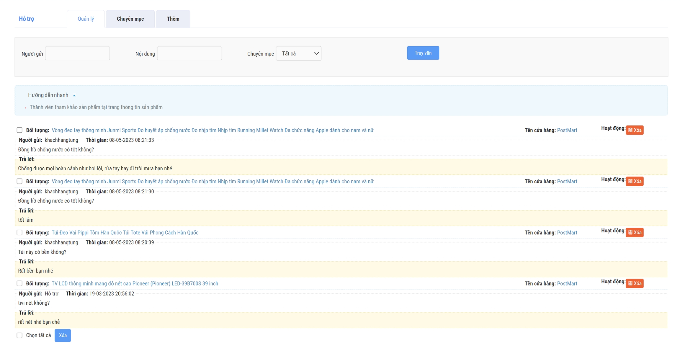 Quản lý các bình luận trả lời câu hỏi cần hỗ trợ của Cửa hàng với Khách hàng