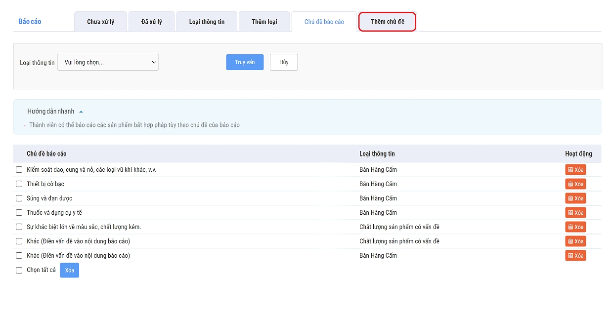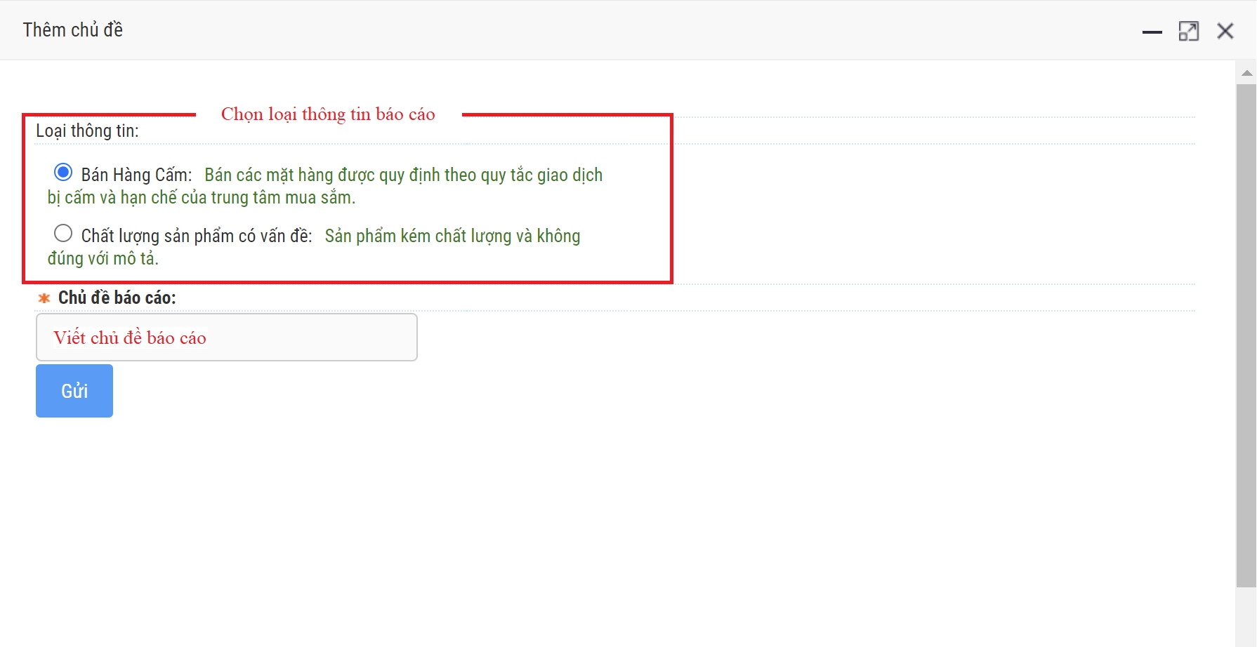 d. Chủ đề báo cáo: Quản lý các chủ để để khách hàng lựa chọn báo cáo về sản phẩm