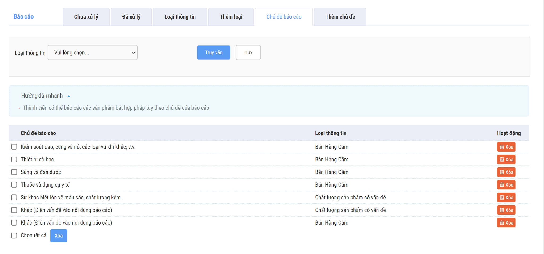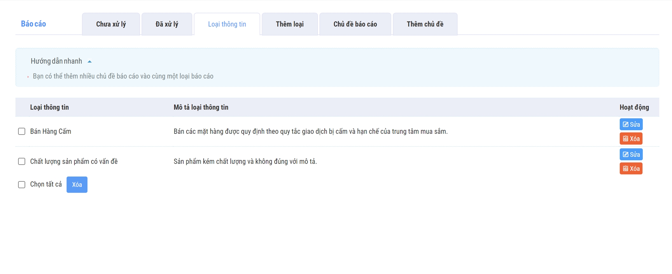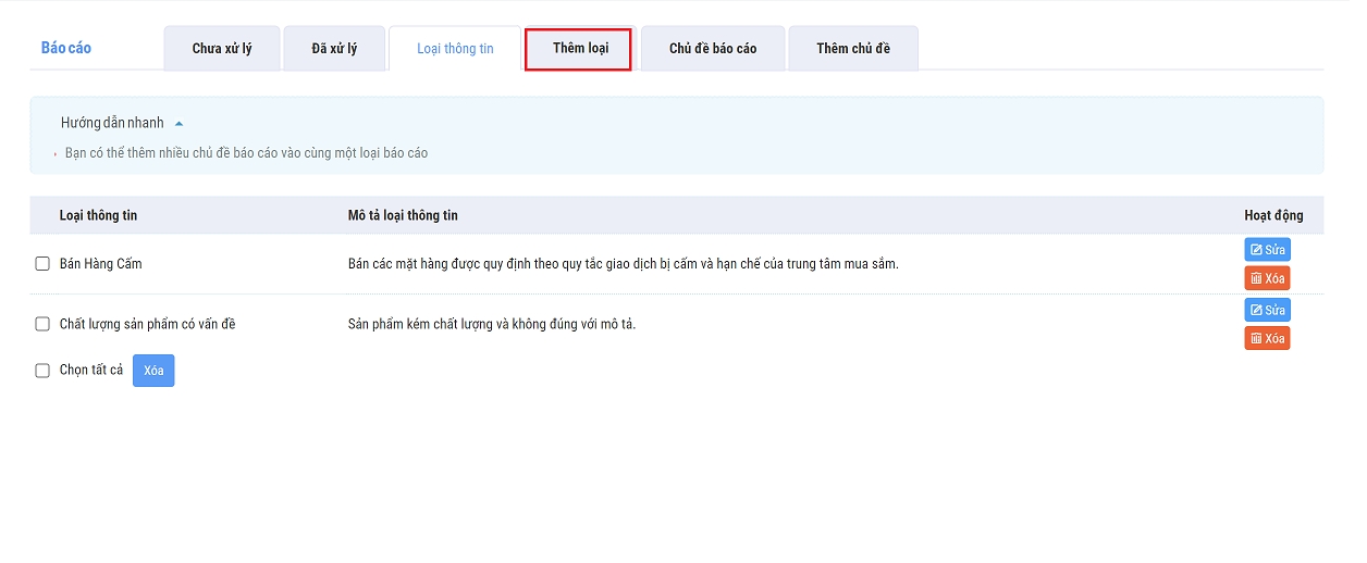 c. Loại Thông tin báo cáo: Quản lý các loại báo báo