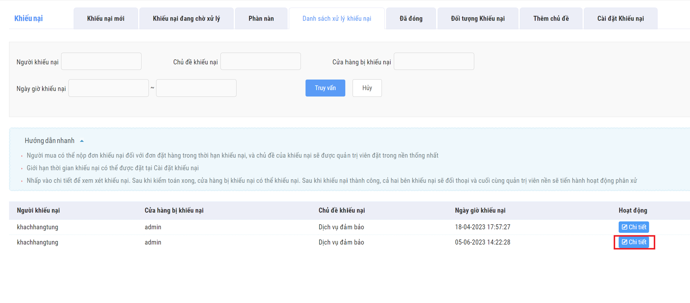 d. Danh sách xử lý khiếu nại: Sau khi đã thống nhất được phương án giải quyết, người dùng sẽ ra quyết định về việc giải quyết khiếu nại
