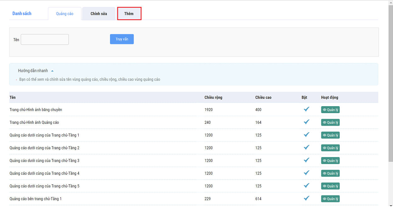 Chức năng giúp người dùng thêm quản lý các hình ảnh quảng cáo hiển thị trên trang chủ của sàn TMĐT Postmart ( Banner ngang, banner cột, pop-up,...)